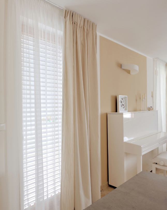 Bílé nebo krémové rolety, dvě vrstvy záclon – průsvitný voál plus těžší průsvitná záclona, a na závěr závěsy ze sametu nebo hedvábí v neutrálních, ale bohatých tónech. Toto je maximální luxus a útulnost v jednom.